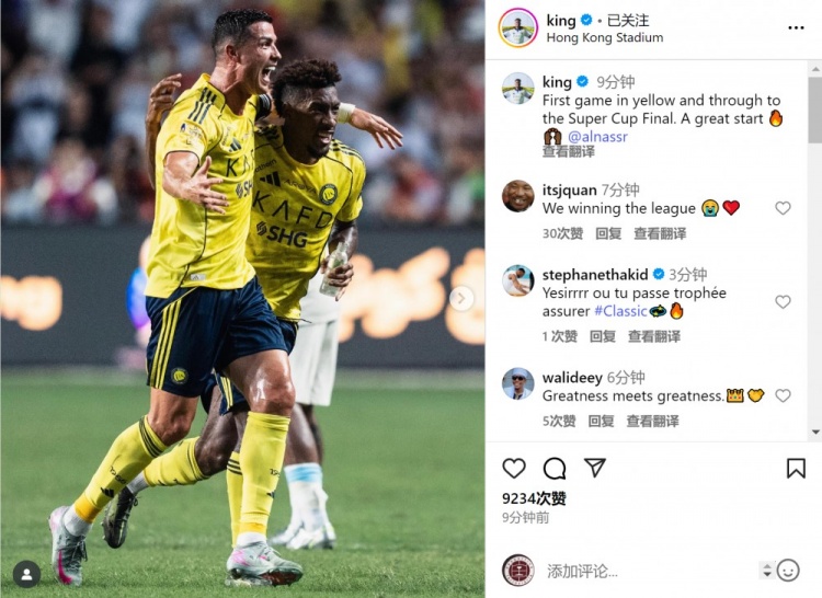 科曼赛后通过社媒发布与C罗共同庆祝的合影,配文道:"身披黄色战袍的首次亮相便晋级沙超杯决赛,这真是完美的开端!"