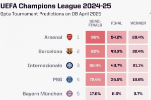 Opta超级计算机预测欧冠概率: